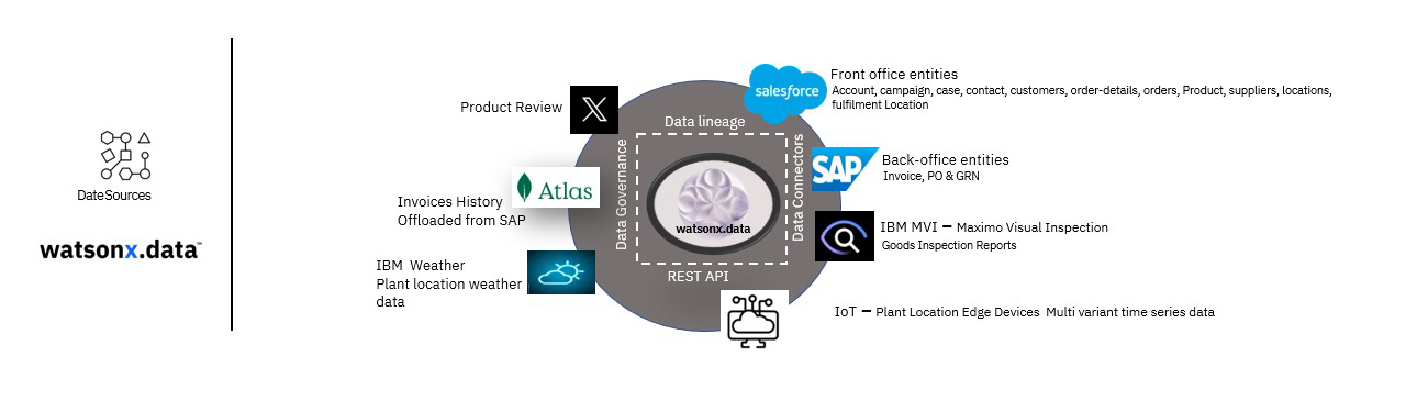 Watsonx Platform actúa como un hub central que consolida datos provenientes de múltiples fuentes, como sensores IoT, sistemas ERP, CRM y bases de datos locales o en la nube. Mediante la solución Watsonx.Data, los datos se organizan en una arquitectura abierta tipo “lakehouse”, lo que permite su acceso y análisis en tiempo real.